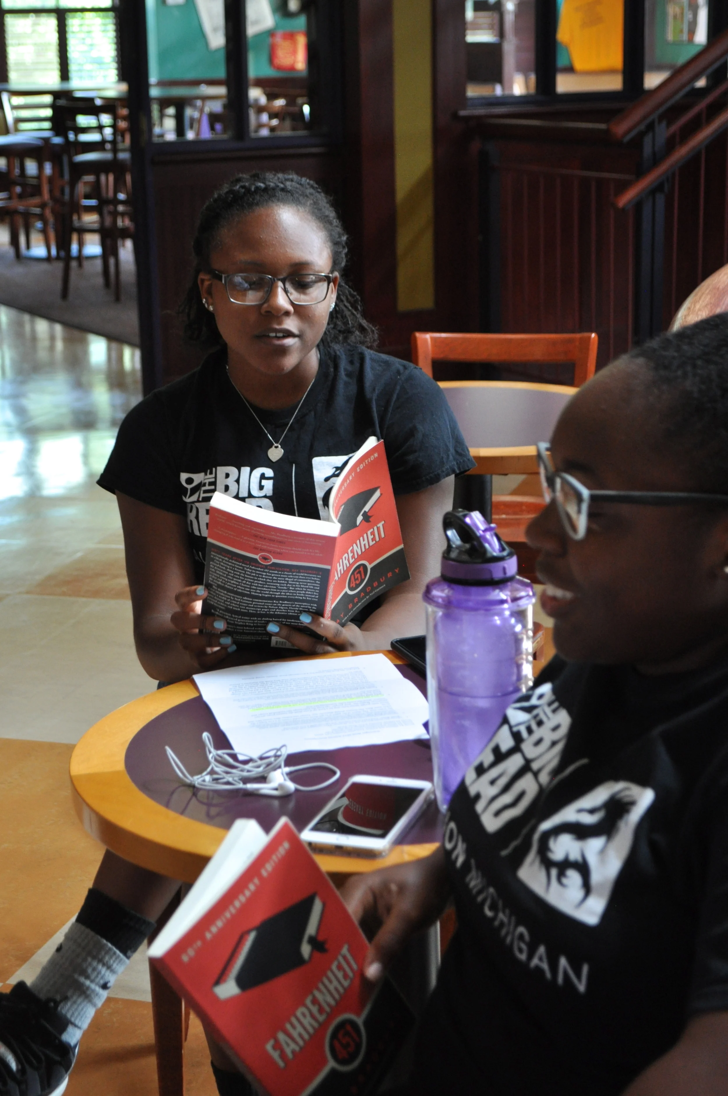 Big Read Leader Denisha and Ta'Jyanna led a discussion that asked participants to think about success. Divided up into small groups, participants defined success and discussed which character they thought was most successful in the world of Fahrenheit 451 and why. The small groups were then asked to assign "emojis" to the character(s) as a response to this question: "How would your character feel about living in our world?" After several minutes, we joined back together and discussed the similarities and differences between the group's decisions and interpretations. We would like to thank the Psi Kappa Omega chapter of Alpha Kappa Alpha, Sorority, Inc. and ASCEND for hosting this discussion.